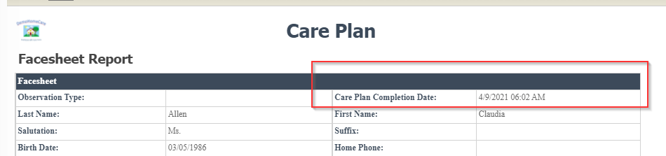 I just did an update on a care plan and this one did not print out the care plan completion date. Is this only for new care plans or reassessments? Odd because the other few I looked at did have the information on them.